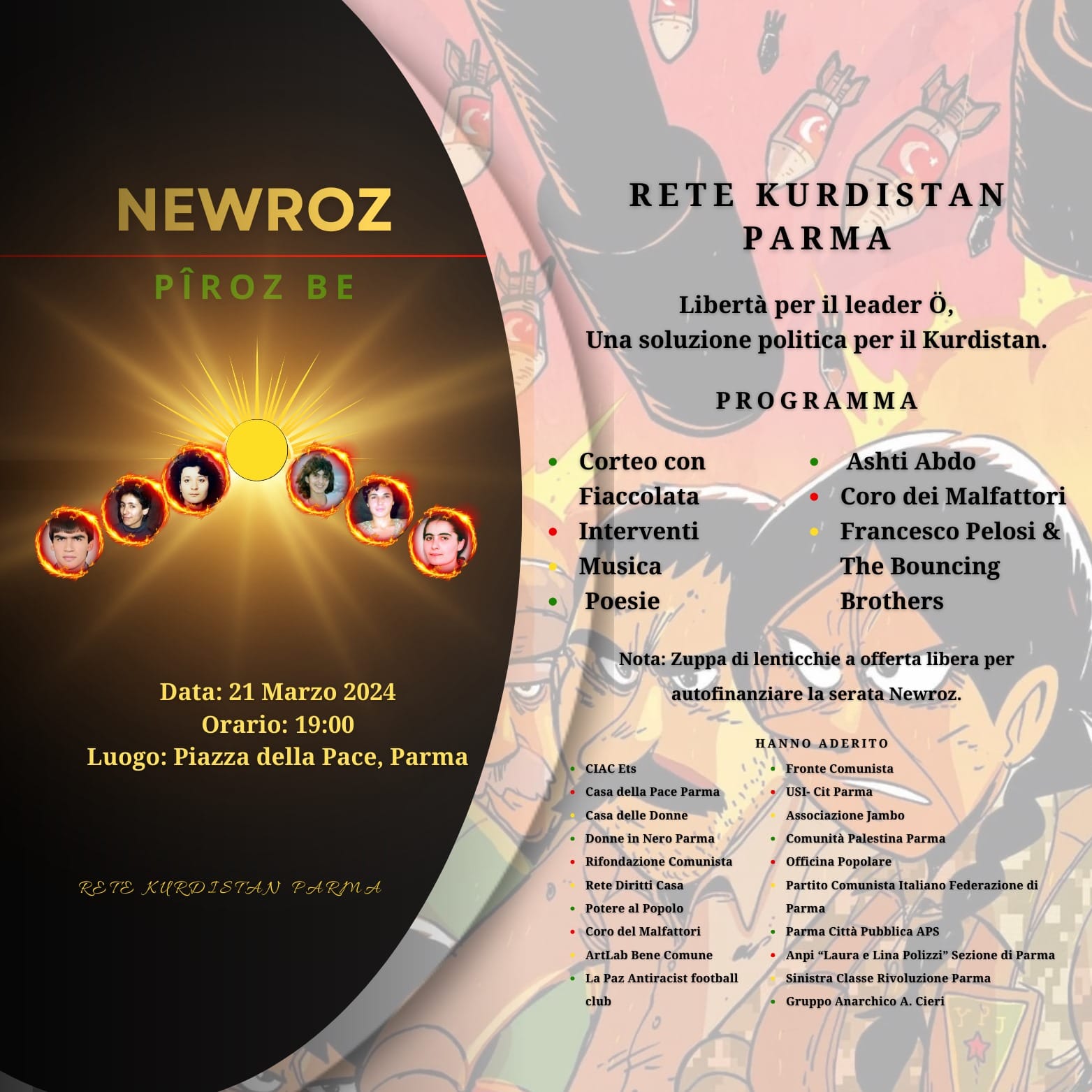 In questo primo giorno di primavera, vi invitiamo a partecipare al NEWROZ 2024, al fianco del popolo Curdo, per far sentire la voce di questo popolo martoriato e oppresso e per trovare quanto prima una soluzione politica.